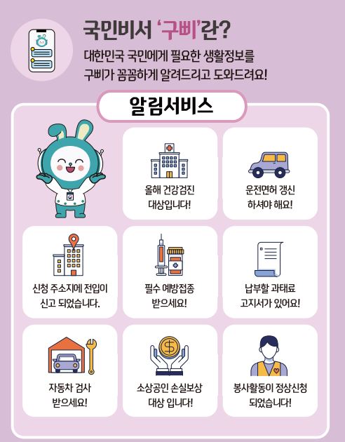 이제는 정부에서 보내는 중요한 알림을 놓치지 않아도 됩니다. 스마트한 국민이라면, 당연히 구삐부터 설정해야겠죠? 필요한 정부 알림을 놓치지 않고 챙기고 싶다면 지금 바로 국민비서 구삐를 만나보세요!